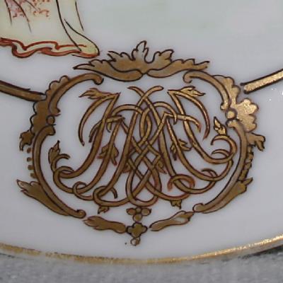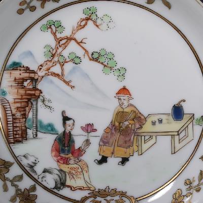 This saucer does not bear an armorial but is nevertheless personalised by an elaborate gold cypher. The scene correlates with Style K6 in Chinese Armorial Porcelain, where 15 armorial services of the decade c.1745-55 bear similar domestic scenes, with just two of these services having an identical scene with the same couple. These are ’Woolf or Fermor’ (the attribution uncertain) and Horner, both illustrated together on p.225 of Volume II. The latter is a particularly charming and imaginative rendition of the scene with the arms of Horner depicted as a bird’s nest hanging from the tree with a bird flying above. See 4th image here for the Horner saucer (for reference only, not for sale).