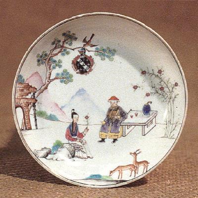 Saucer, c.1755, finely potted and painted, with a scene of a Chinese couple taking refreshment on a terrace in a mountainous landscape, the lady holding a flower in her hand.