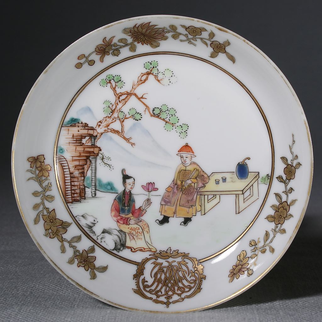 Saucer, Qianlong c.1755, with Chinese scene and a European cypher