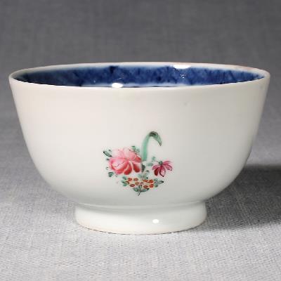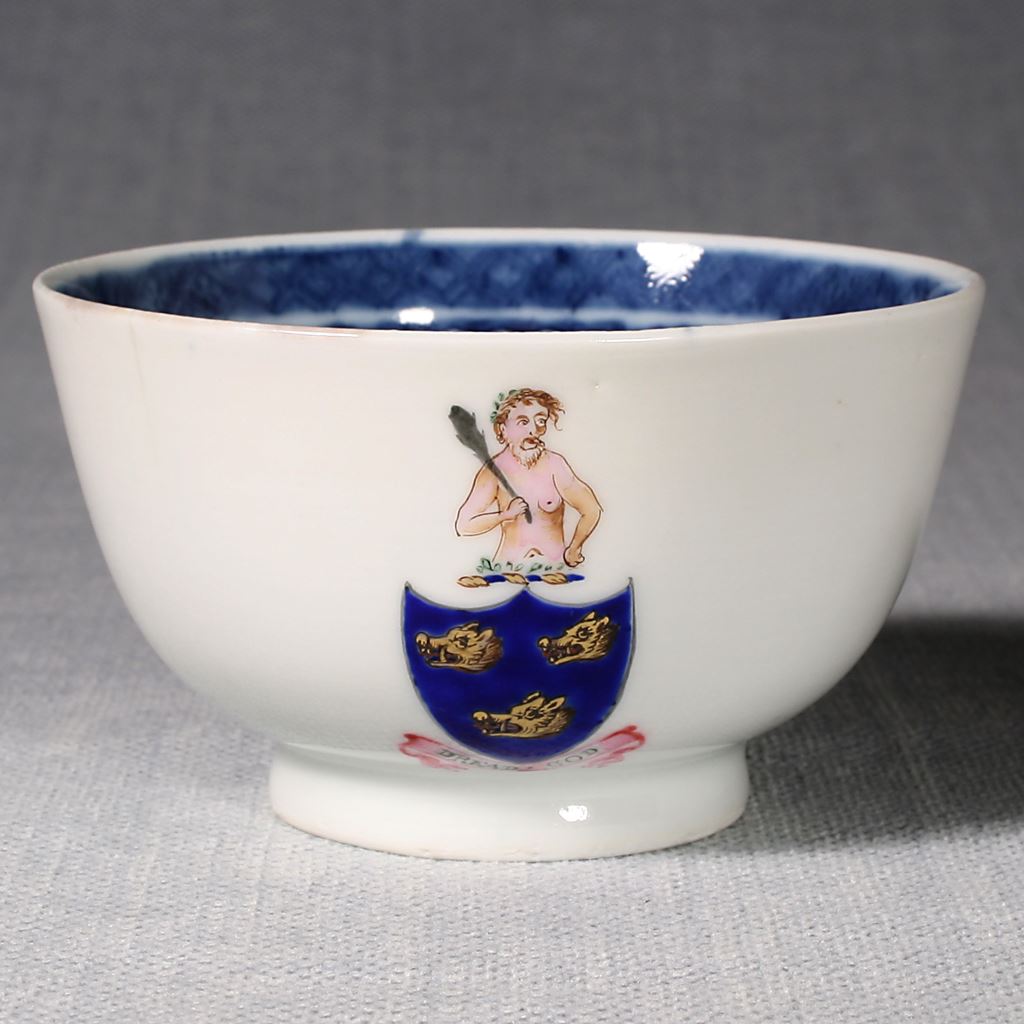Teabowl, c.1790, with the arms of Gordon of Lochinvar, with three gold boars’ heads on a blue shield and motto ’Dread God’. The reverse with a small spray of flowers and leaves in famille rose enamels.