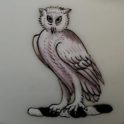 The second service, of which only a guglet, punch bowl and tankard, all drinking wares, are known, was painted with a more elaborate armorial surrounded by heraldic mantling while the motto scroll remains empty. See stock numbers 44127, 44128 and 44129 for the guglet, bowl and tankard respectively.