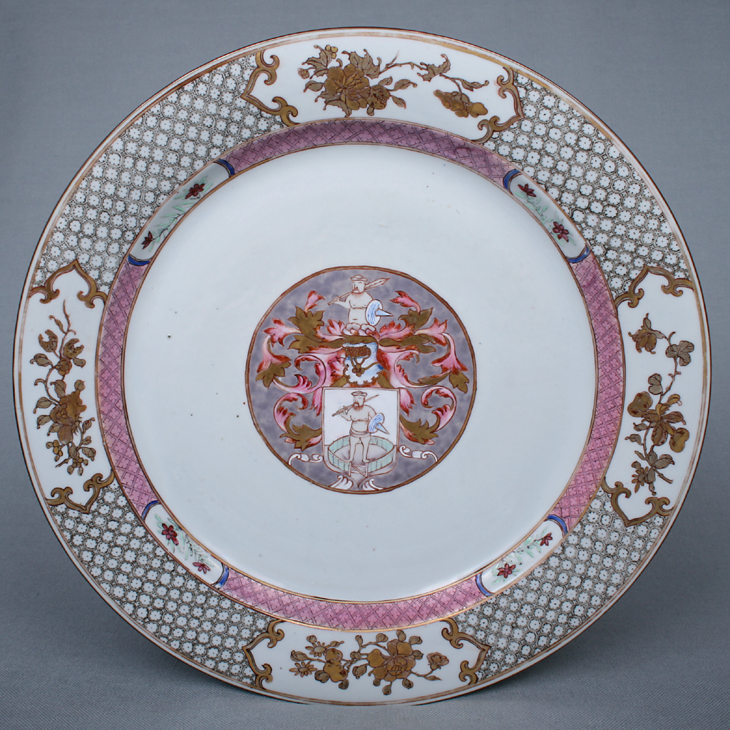 Dish, c.1733, with the Dutch arms of Tuineman, the fenced enclosure being a pun on the word ‘tuin’. Made for Daniel Tuineman the Younger of the Dutch East India Company (VOC) who visited Canton that year as 2nd Mate on the Dutch East Indiaman Nieuwvliet. He ordered two sets of porcelain, but was later lost at sea in 1740 as Captain of the Langewijk.