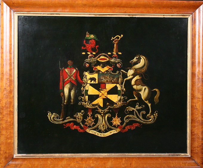 The arms are of Sir James Campbell (1773?-1835), army officer and colonial governor. Having entered the army in the 1790s he joined the 94th Regiment in Madras in 1802 as a captain, serving under Major-General the Hon. Arthur Wellesley (later Duke of Wellington). He distinguished himself in the Indian wars, being mentioned in dispatches and being promoted to the rank of lieutenant-colonel by 1804.